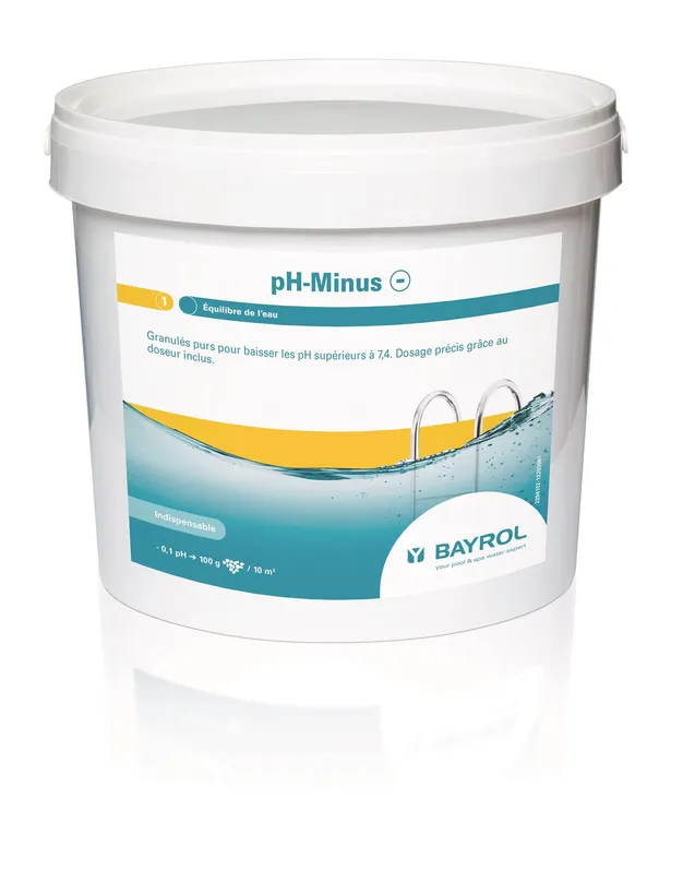Le pH Minus BAYROL, permet de baisser les pH supérieurs à 7,4. La pureté de sa formule assure une action efficace et rapide. Son dosage est facile grâce au doseur inclus. Conditionné sous forme de poudre, il est compatible avec tous les traitements (brome, oxygène actif, PHMB,…), tous les revêtements (liner, carrelage, silico-marbreux, polyester). Contient: Hydrogénosulfate de sodium.